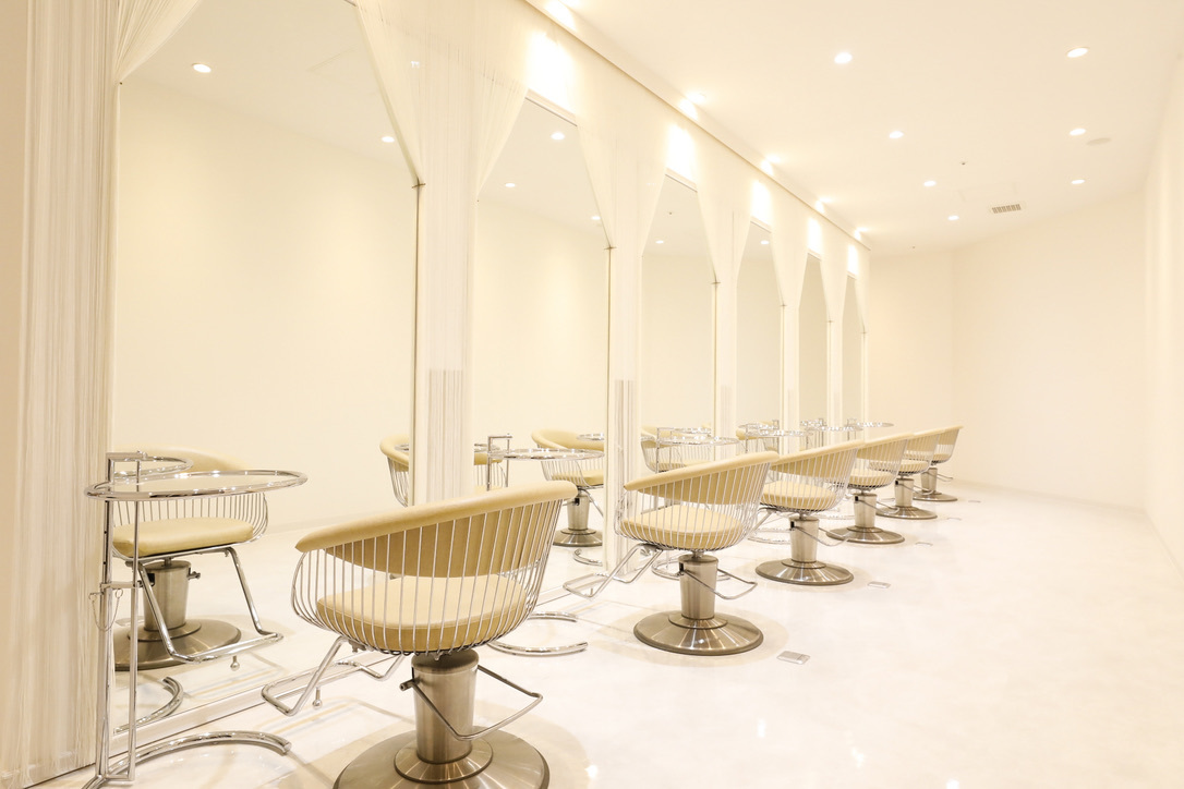 お席の大きな鏡には真っ白なカーテンがあり、ヘッドスパやヘアカラーなどの施述中にお休みになられている間、鏡を閉じさせて頂いております。